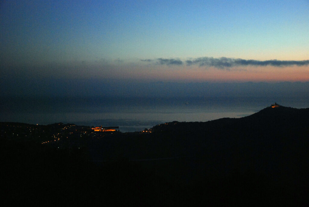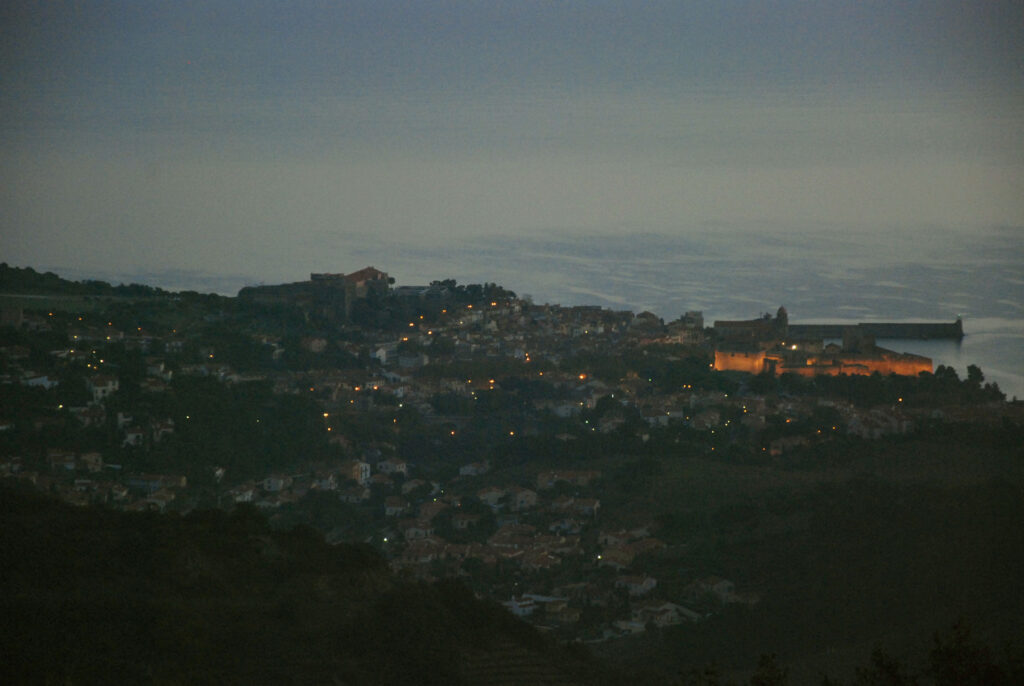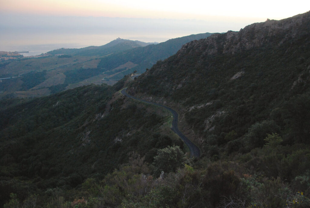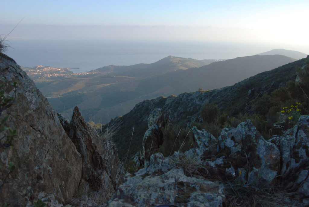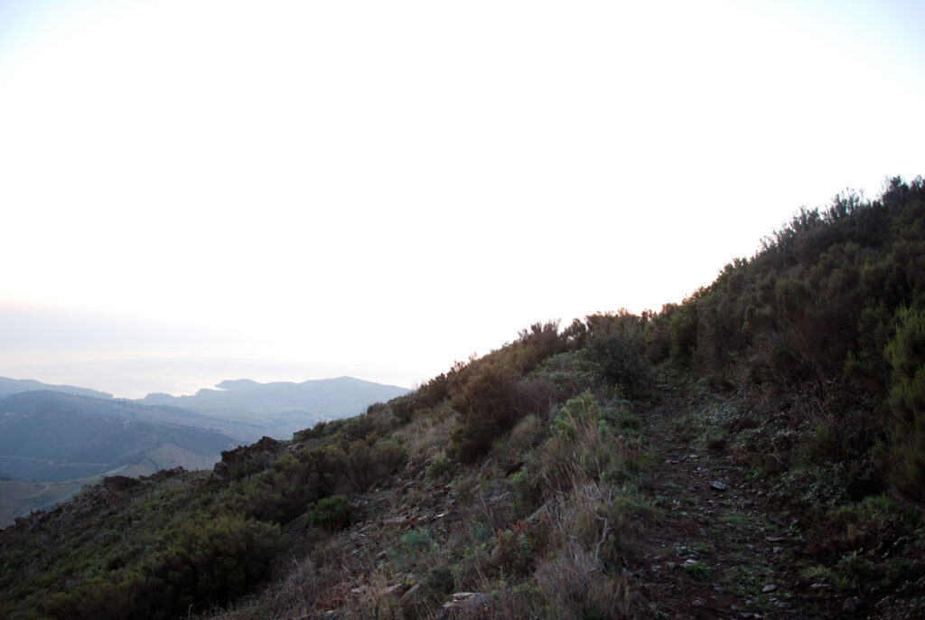 He subido a pie hasta donde la carretera empieza a bajar a Banyuls-sur-Mer y de ahí he subido un camino muy empinado a la Tour Madeloc. Todo esto mientras amanecía.
