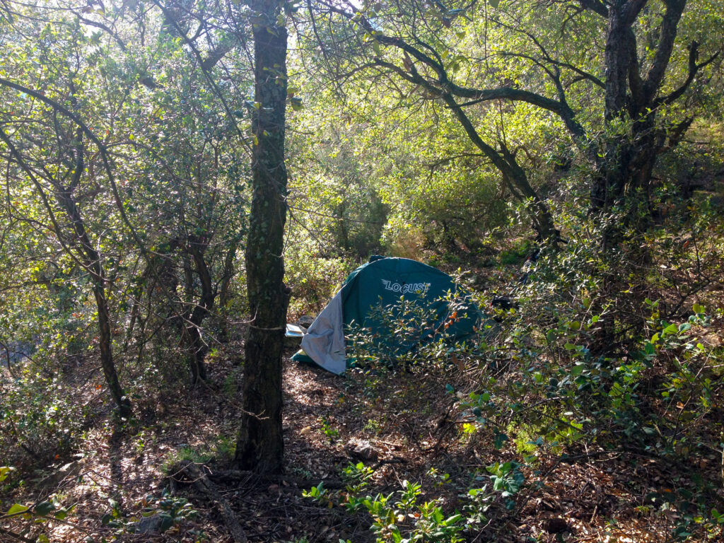 Estoy en el bosque entre la carretera que sube a Tour Madeloc. Me he despertado cuando el sol empezaba a aclarar el día, antes de que apareciera detrás de unas nubes bajas por el Cap de Creus, como a las 7:30 h. En realidad me ha despertado un helicóptero que estaba dando vueltas por encima de la zona.