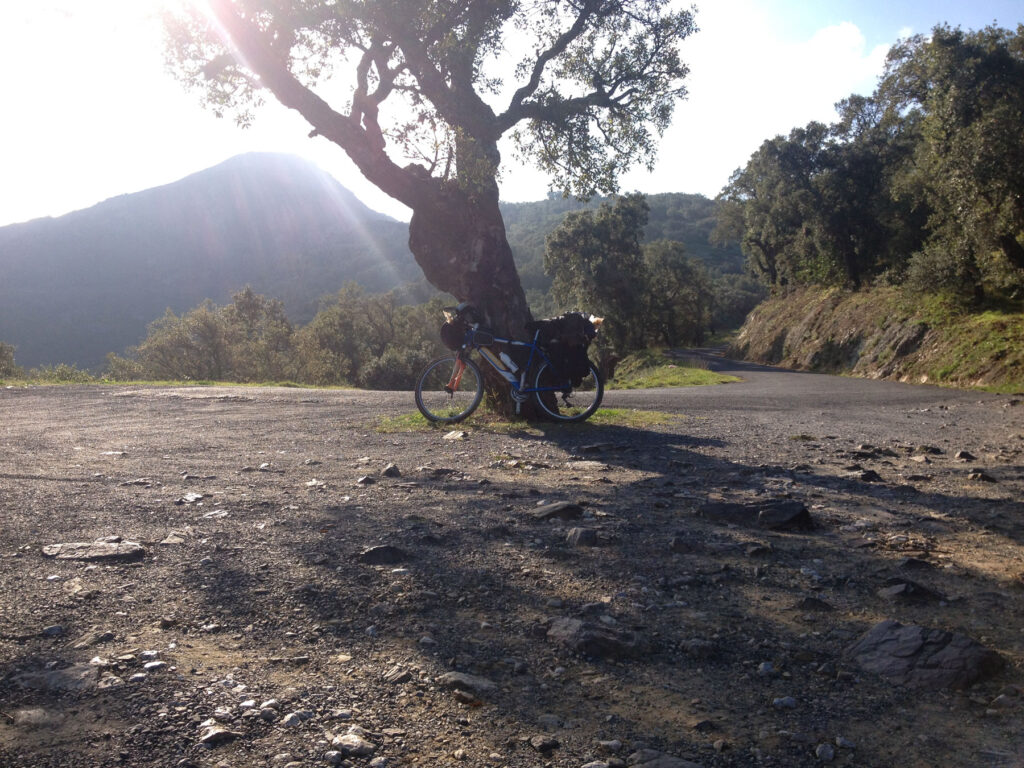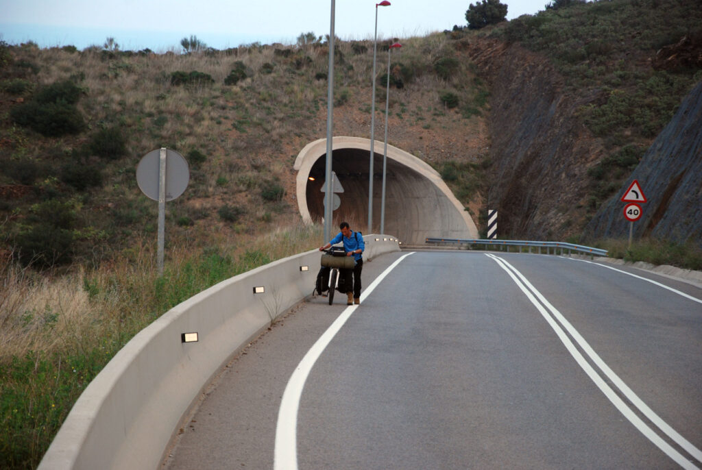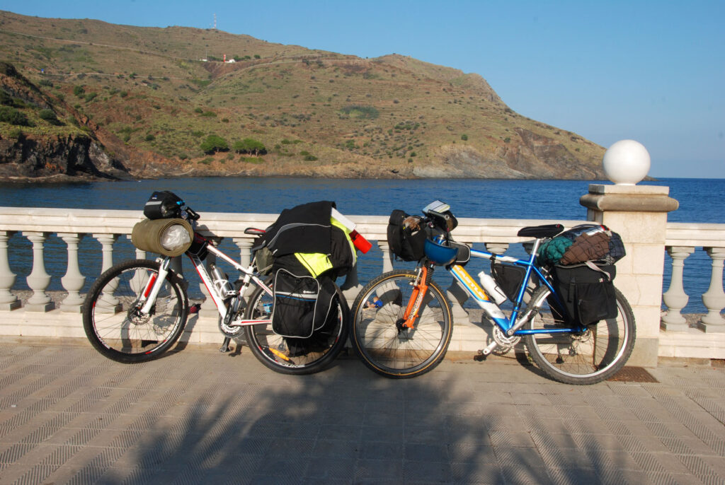 Nada más llegar a Portbou, me encuentro en la playa con un hombre oriental que va en bici como yo. Desde el principio me llama la atención lo similar de nuestro rollo. Tenemos una bici de montaña, alforjas, la misma bolsa de manillar… Me invita a un cigarro y me empieza a hablar de Corea, de China, de Japón, de Francia y España. Dice que en la TV de Corea todo el rato dicen «Alberto». Y enseguida empezara a llamarme «su profesor».