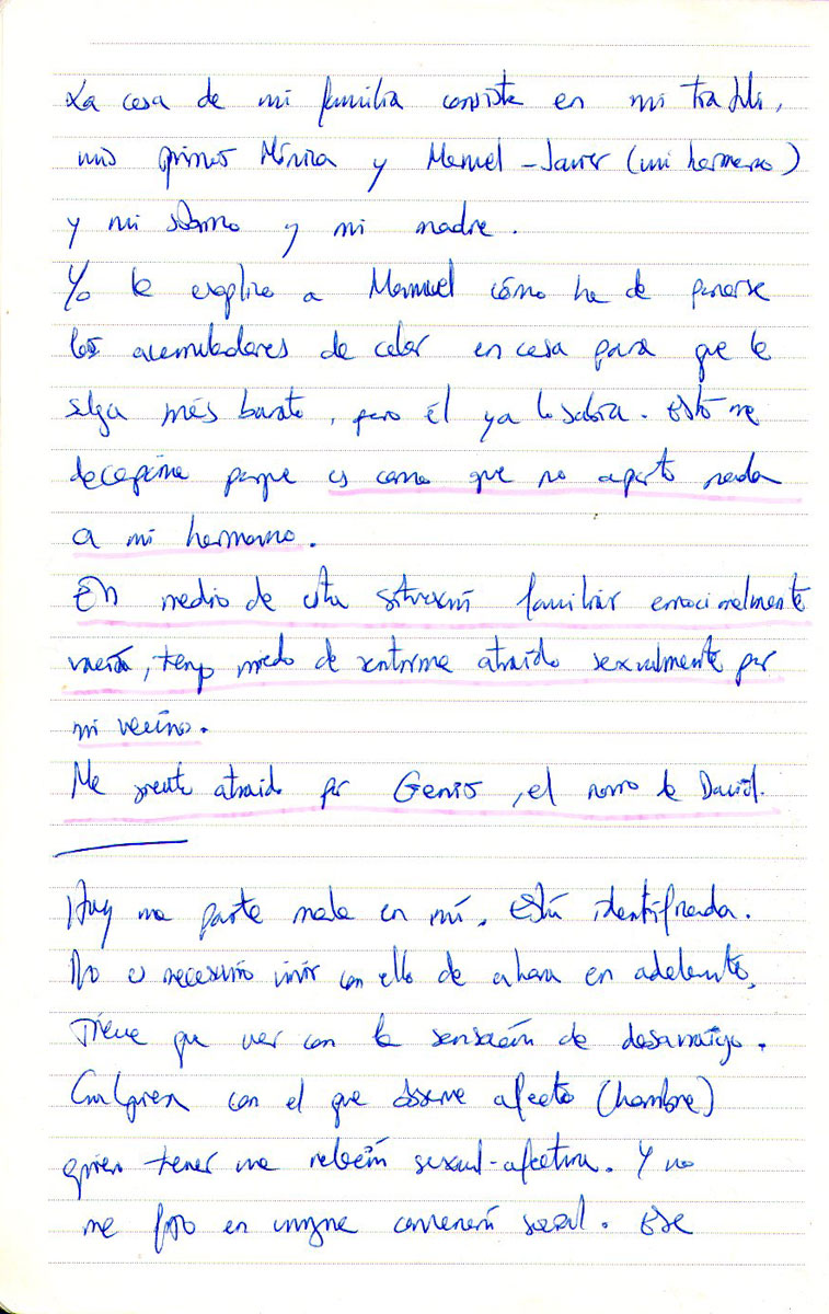 Por las últimas sesiones, he visto que el conflicto no está directamente relacionado con la ruptura sentimental, con la separación de Julen, sino con dejar la casa, mi casa. Siempre he asociado CASA-PAREJA como una unidad indisociable y esto ha ido en contra mía a nivel vivencial e incluso al enfocar el problema de la piel. Es cierto que el problema surgió cuando me fui a Lisboa y salí de mi casa, a donde por cierto ya no he vuelto… y, como vivía con mi pareja (Julen) en la casa prácticamente desde el principio, relacioné la aparición del eczema a la separación afectiva. Esto, unido a toda la literatura que relaciona los problemas de piel con la separación me hizo reafirmarme en esta postura. Sin embargo, acabo de darme cuenta de que antes de abandonar la casa de Barcelona, mi casa, estuvo un tiempo viviendo Pau el alemán conmigo. Pau no era mi pareja aunque yo lo pretendiera. No había amor, ni unión y, sin embargo, no tenía ningún problema de piel. El momento justo de la aparición del problema fue al llegar a Lisboa. Ahí empezó la separación con mi casa. Si se me fue el problema temporalmente con Adam fue porque me sentía recuperando la seguridad que da la pareja. Todo va relacionado al final pero, hoy por hoy, lo que tengo que hacer es procurarme la seguridad, ocupar mi lugar en la familia y en el mundo, hacer mi trabajo y vivir de ello.