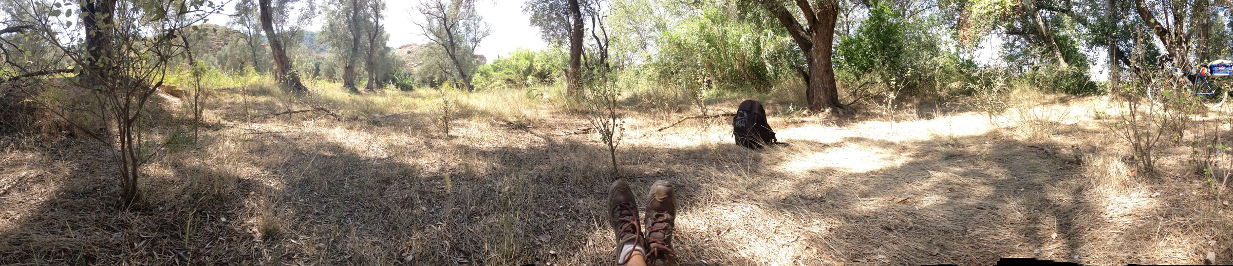 He dormido muy bien. Me levanto con el sol y me paso la mañana en la tienda. Lo primero que hago al levantarme es acercarme al camino para comprobar que no se me ve. Ahora sé que estoy seguro aquí en este campo entre el río y el camino bajo la montaña y que, aunque de tanto en tanto pasa un ciclista, un corredor o un coche, no llamo la atención. Así que estoy tomándome la mañana para escribir, pensar, descansar, aprovechando este lugar en el que puedo jugar a enraizarme.