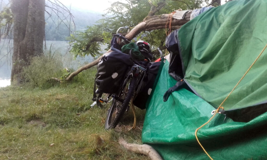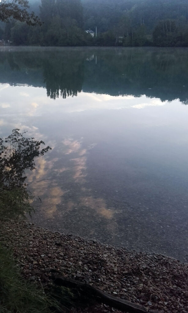 Aunque he dormido como cuatro o cinco horas (me acosté hacia las 2 y me he levantado hacia las 7) estoy bien. Sé que no podré hacer mucho esfuerzo hoy porque van a hacer como 35 grados (según me dice un hombre parecido a Obélix que viene aquí a bañarse) y estoy acostumbrado a dormir 7-8 horas. Amanece desde el río y mi material, levemente mojado por la humedad, se va secando sobre la acacia caída que me ha servido de refugio y ahora de tendedero. Me paso 3 horas aquí desayunando, lavando cuatro trapos y estando simplemente. La mujer del Obélix contemporáneo mete los pies en el río mientras su marido se sumerge y recoge una hierba que resulta ser menta acuática.