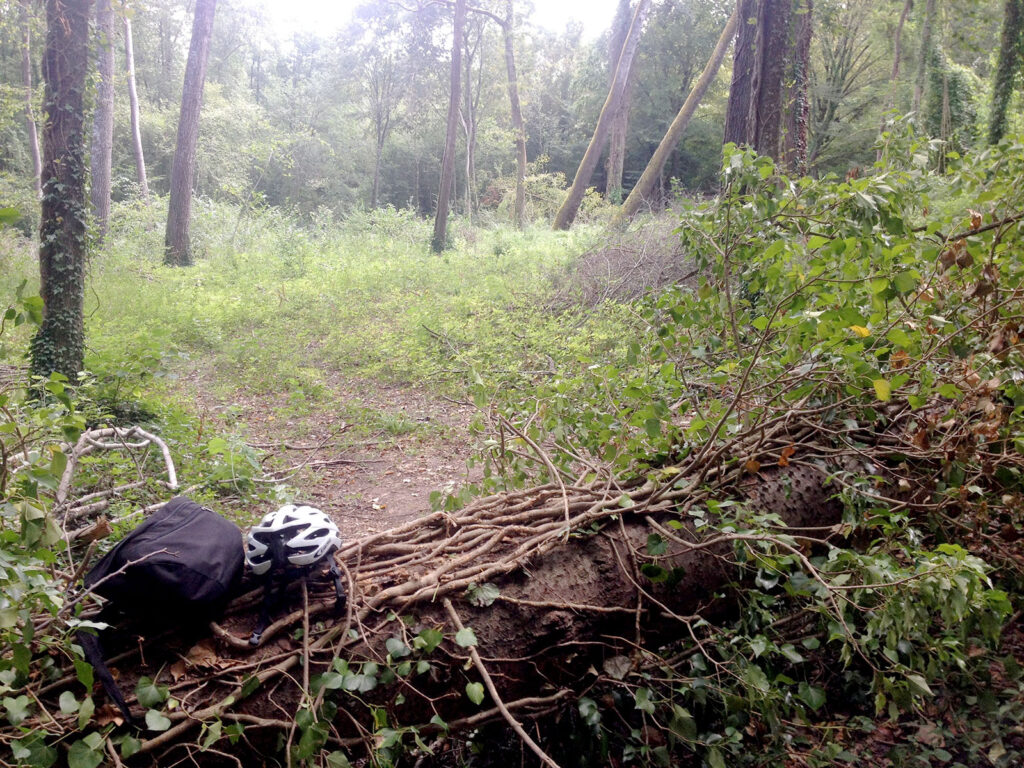 De Buno-Bonnevaux a Malesherbes voy por caminos siguiendo la ribera del río. En un momento aparece un árbol caído en medio del camino y aprovecho para comer algo, que ya tengo hambre (con el susto no estaba haciendo caso a mi cuerpo) y, de paso veo que puedo bordearlo sin problema y sin necesidad de pasar por encima haciendo un super esfuerzo, que es lo que hubiera hecho normalmente. Un obstáculo siempre es positivo, sólo hay que saber verlo así.