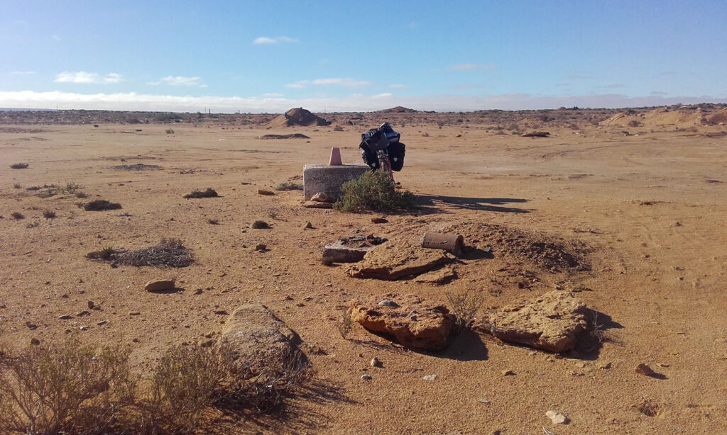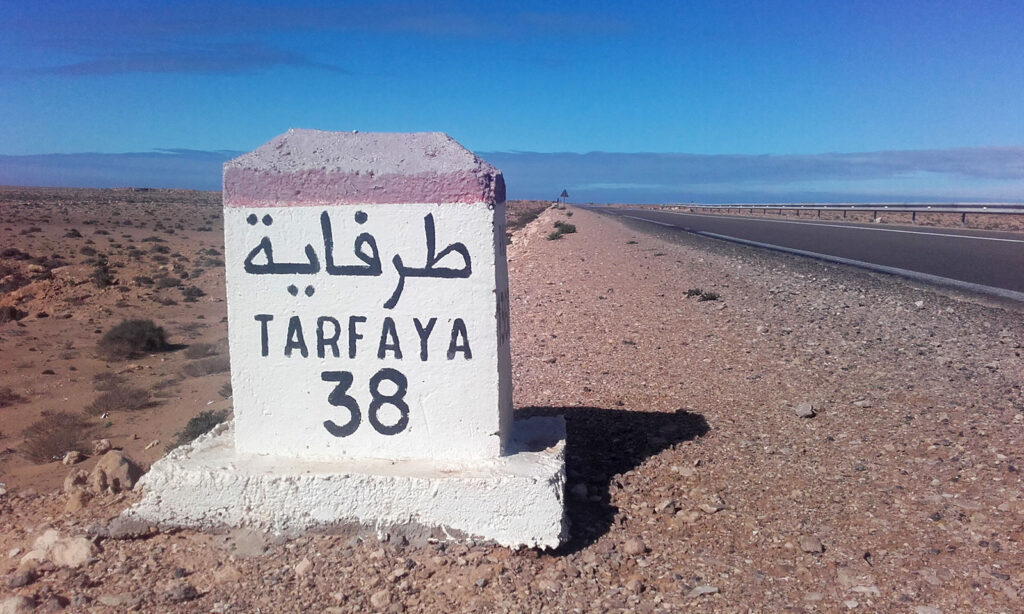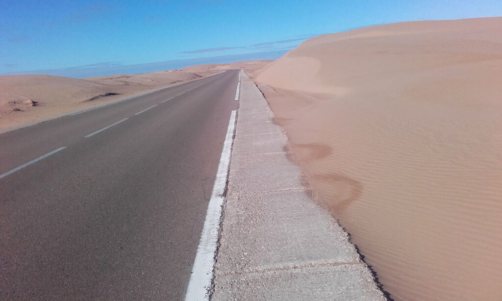 El camino es agradable, lo cubro en tres horas. Cuando llego a Tarfaya, una ciudad fantasma, entro en un café, me como unos bollos y yogures mientras cargo baterías. Al pagar me toca el hombro alguien. ¡Es Pol! acompañado del de Zaragoza. Flipo al verlos, ya no me lo esperaba porque pensaba que ya habrían salido de esta zona pero no, salen luego y yo con ellos hacia El Aaiún. Hoy se van tres a Marrakech desde Tarfaya así que ahora hay más sitio en el camión. Me cuentan que les ha dado un toque la policía por dormir más de una noche en el mismo sitio. A mí otro me pide los datos y me ha sugerido un hotel… en fin.