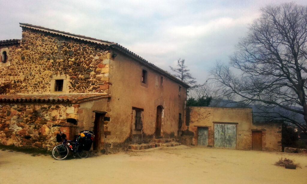 Sigo unos pocos kilómetros más por la C17, cuesta arriba, mucho tráfico. Aunque la bici ya parece que va bien me estoy dando cuenta de que este viaje voy demasiado cargado. Llego al siguiente pueblo: Figaró-Montmany. La situación de la noche anterior se repite: otro tipo se me acerca y me indica como llegar a una ermita. Pero esta vez el recinto está vallado aunque no es un inconveniente y me las arreglo para entrar. La hierba está alta, hay un torrente al lado, me baño. Hace muy buena noche.