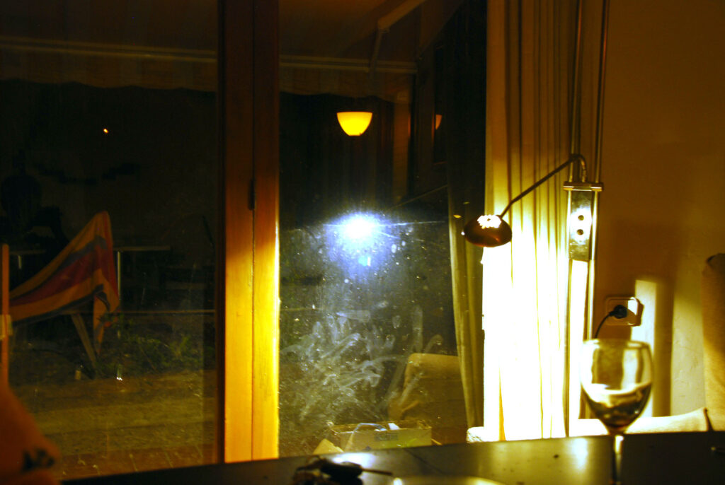 Accidente con el coche yendo por la mañana al pueblo a por croissants. Aún estoy bajo el efecto de los monguis. El suelo está muy mojado, me resbalo, pierdo el control y me golpeo de frente contra el quitamiedos. He destrozado la parte delantera del coche pero puedo seguir moviéndome con él.